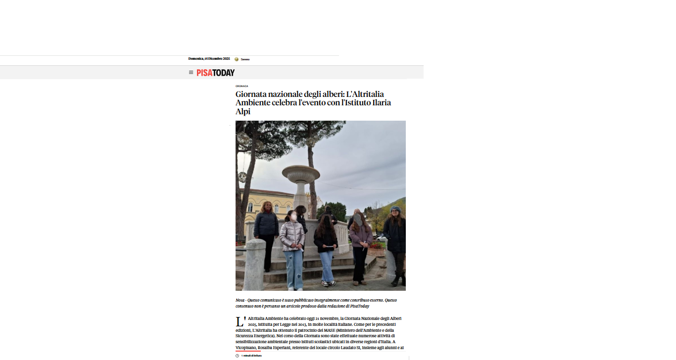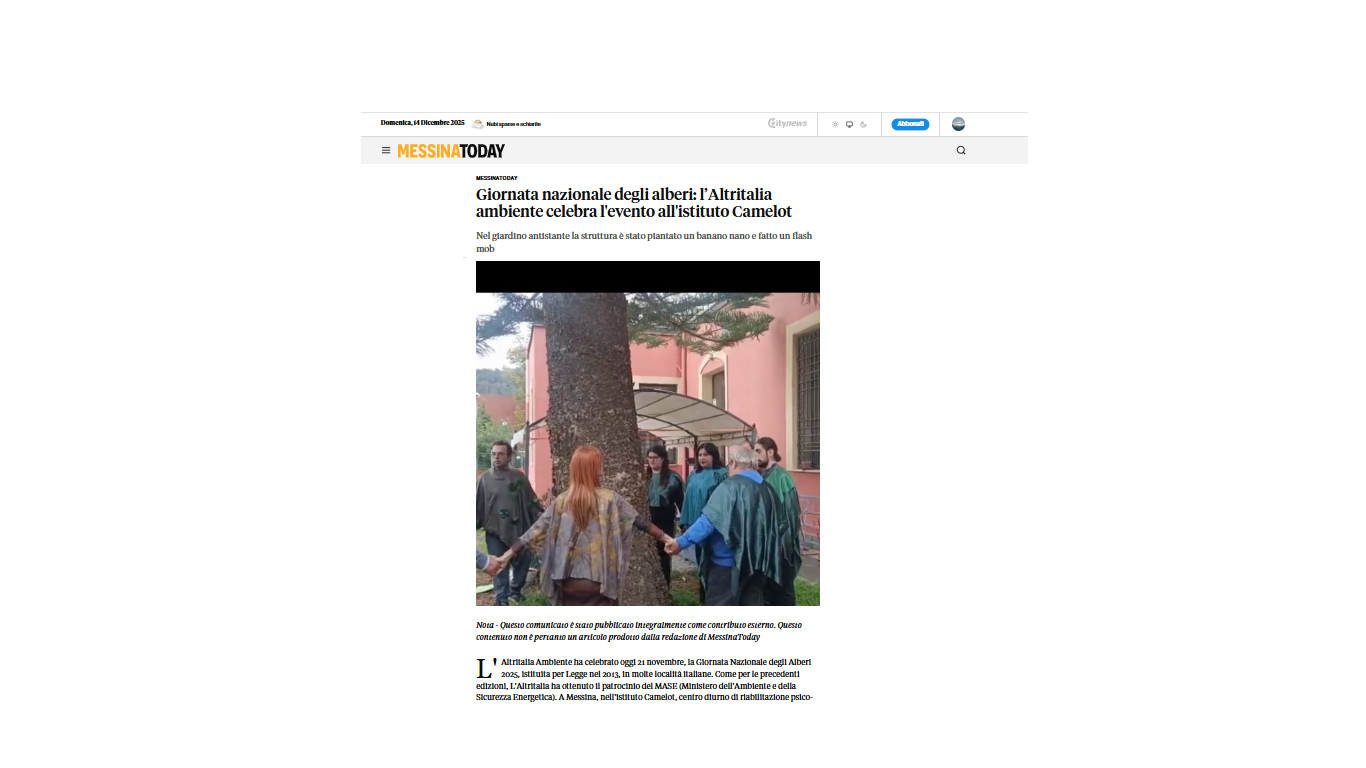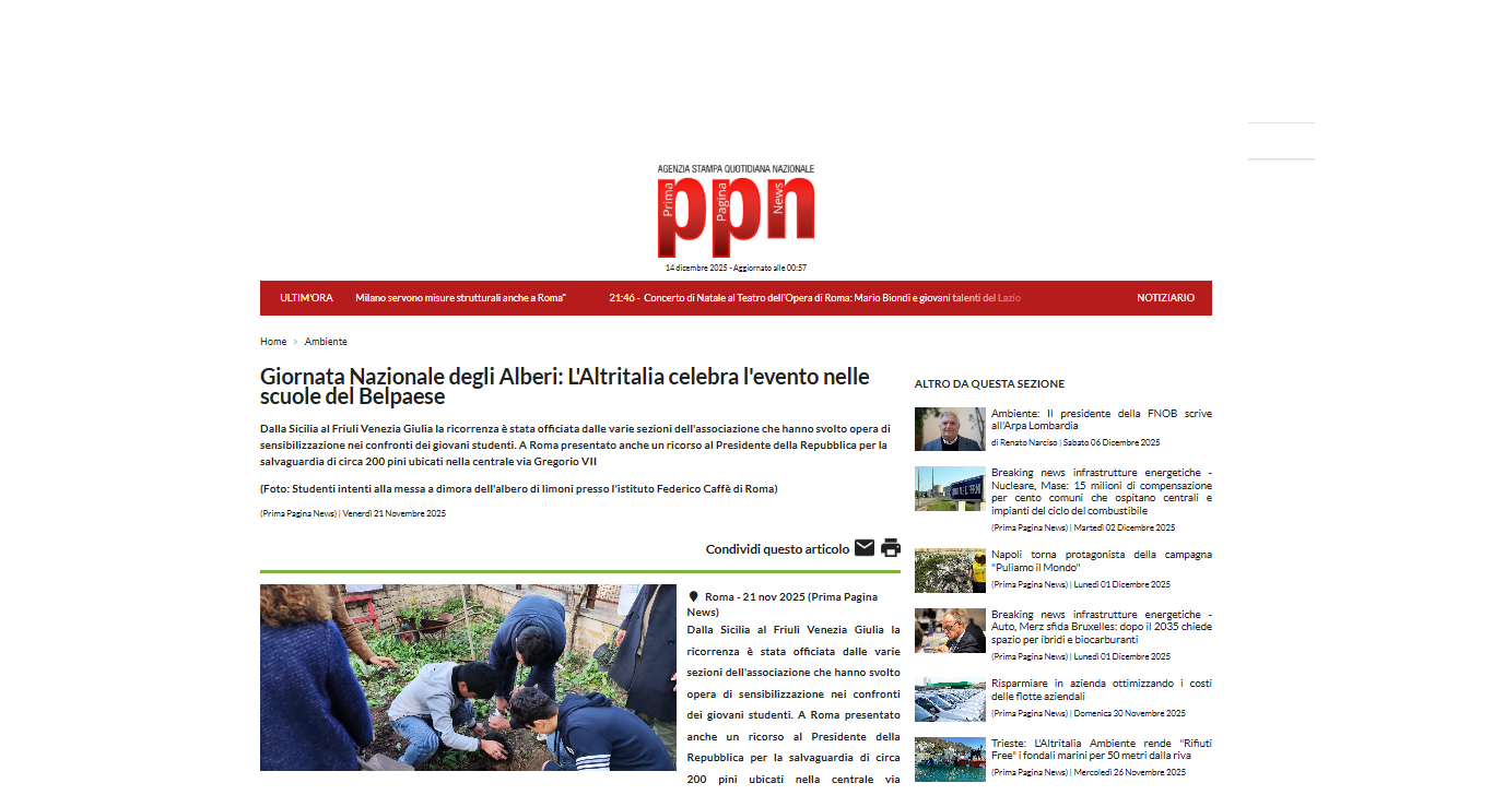 https://www.foggiatoday.it/attualita/giornata-alberi-foggia-2025.html https://www.messinatoday.it/giornata-nazionale-degli-alberi-l-altritalia-ambiente-celebra-l-evento-all-istituto-camelot-13229790.html https://www.firenzetoday.it/green/life/giornata-nazionale-alberi-altritalia-ambiente-celebra-evento-istituto-marchesi.html https://www.primapaginanews.it/articoli/giornata-nazionale-degli-alberi-l-altritalia-celebra-l-evento-nelle-scuole-del-belpaese-551955 https://www.pisatoday.it/cronaca/giornata-nazionale-degli-alberi-l-altritalia-ambiente-celebra-l-evento-con-l-istituto-ilaria-alpi-13229943.html 0 comment 0 FacebookTwitterLinkedinWhatsapp Redazione Articolo precedente L’Altritalia Ambiente incontra Borgonzoni per i lecci della reggia di Caserta Prossimo Articolo Convegno a Trieste sui fondali del golfo Articoli correlati Convegno a Trieste sui fondali del golfo 15 Dicembre 2025 L’Altritalia Ambiente incontra Borgonzoni per i lecci della reggia di... 13 Dicembre 2025 L’Altritalia con Coldiretti contro il cibo sintetico 28 Novembre 2025 L’approvazione de L’Altritalia alle dichiarazioni di Lollobrigida 28 Novembre 2025 Fondali marini: La sezione di Trieste ripulisce il Canale di... 10 Ottobre 2025 Trieste: I volontari recuperano rete sul fondale 21 Agosto 2025